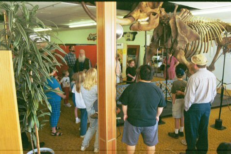 This model (sculpted by Joe Taylor) of a giant human femur (leg bone) is a popular exhibit. The sculpture is mounted over a drawing to scale to show how large this person was. There really were giant humans. Click here for the story behind this sculptured bone. Besides the main exhibit area the museum building houses spacious fossil prep and casting rooms. Visitors find it fascinating to see how fossils are readied for display. |