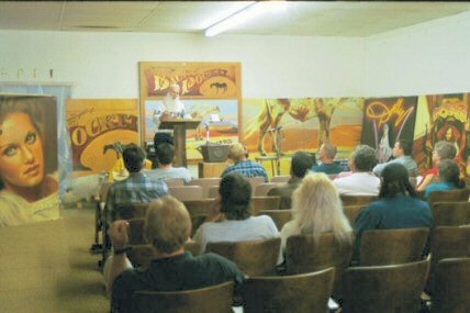 The museum also has a meeting area. The speaking area is currently surrounded by numerous billboards from Sunset Strip in Hollywood, California (painted by Joe Taylor) of popular singing performers from the 1970s and 1980s. Visitors are surprised to find this unique art collection in the middle of a fossil museum.